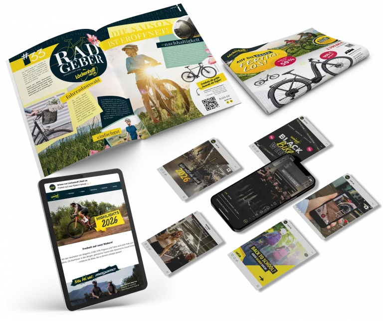 Für Löckenhoff & Schulte, dem regionalen Fahrrad- und E-Bikehändler mit dem größten Vor-Ort-Sortiment und riesigem Onlineshop, realisieren wir kanalübergreifende Kommunikationsmaßnahmen – von klassischen Anzeigen und Prospekten über Social Media, Ads und Newsletter bis hin zu Videoformaten. Immer mit dem Ziel, Marke und Angebote wirkungsvoll bei der richtigen Zielgruppe zu platzieren.